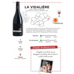 La cuvée Vidalière rouge a une belle robe grenat intense aux reflets violacés. Son nez riche et épicé dévoile des notes de garrigue et de violette, accompagné par une bouche fraîche, croquante et fruitée.