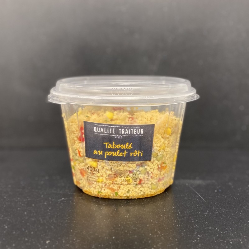 Légumes 27% (tomate, petit pois, poivron ), semoule de BLE dur précuite 23%, eau, viande de poulet, traité en salaison, cuit rôti 10% (viande de poulet (Origine : France ) 8,7%, eau, fécule de manioc, dextrose, sel), maïs 8%, huile de colza, vinaigre d'alcool, huile d'olive vierge extra, sel, jus de citron à base de concentré, tomato ketchup (tomates, vinaigre, sucre, sel, extrait d'épices et d’herbes (contient CELERI), épice), persil, purée de citron sucrée (citron, sucre, jus de citron), sucre, ail, cumin 0,08%, fenouil, coriandre, poivre, piment, épaississant