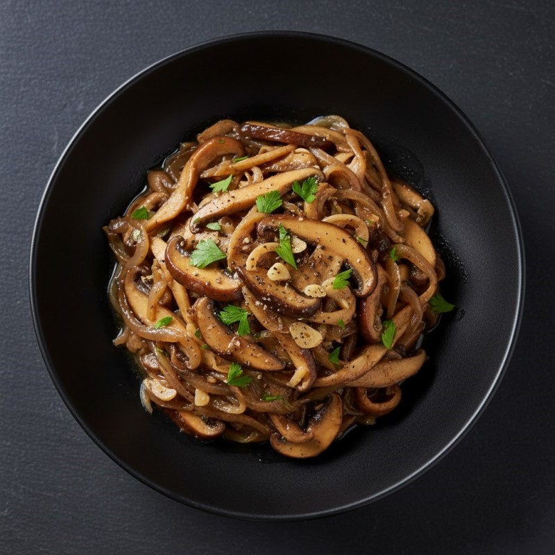 Cette fricassée de cèpes est une préparation savoureuse. Les cèpes sont cuisinés avec des oignons, du persil et de l'ail. L'ensemble offre un plat d'accompagnement parfumé et riche en goût.