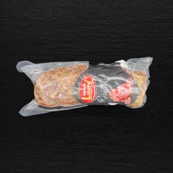 Jambon et poitrine de coche, gras de porc, sel, poivre, sucres (LACTOSE, dextrose, saccharose), épices, conservateur : nitrite de potassium, arome naturelle, ferments, boyau naturel de porc.