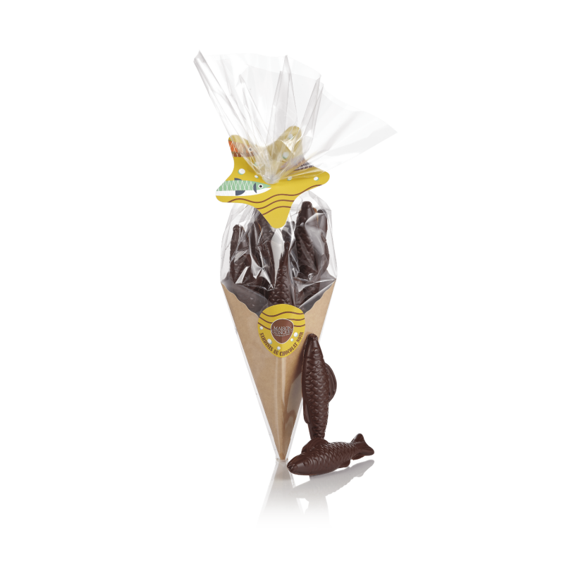 Le cornet sardine renferme d’adorables sardines en chocolat noir aux éclats de crêpe dentelle croustillante. Une alliance parfaite entre fondant et croquant, dans un format ludique et original.