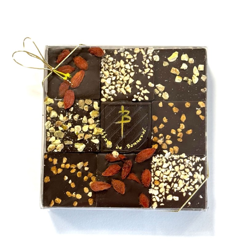 Ces Napolitains sont de fines tablettes de chocolat noir ou au lait, idéales pour l'accompagnement d'un café. Chaque carré est une œuvre d'art gourmande, décoré de garnitures variées : amandes grillées, éclats de pistache, morceaux de nougat, ou l'originalité des baies de Goji.