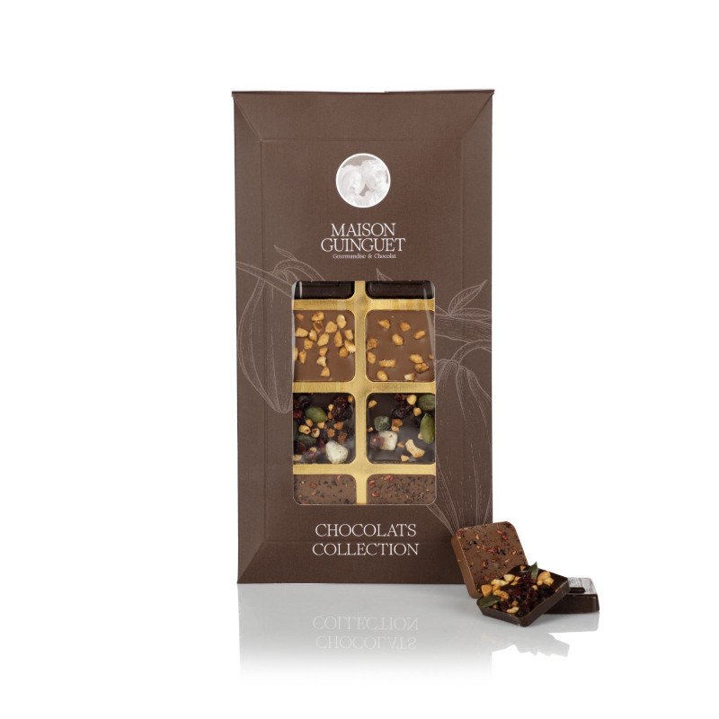 Chocolats Noir 70% de cacao, LAIT 36% de cacao et Blond. INGRÉDIENTS : sucre, beurre de cacao, masse de cacao, NOISETTE, poudre de LAIT entier, CREME, AMANDE, cranberries (canneberge, sirop de saccharose, huile de tournesol), poudre de LAIT écrémé, chocolat LAIT caramel, poudre de LACTOSERUM, cubes d'orange (écorce d'orange, sucre, dextrose de mais, sirop de fructose, conservateur: E202, E223, acidifiant : acide citrique), graines de courge, huile de tournesol, framboise, sirop de glucose, eau, arôme naturel de vanille, farine de BLE, sucre caramelise, sel, cate soluble, fibres de chicorée, chicorée soluble, BEURRE, malt d'ORGE epices, protéines de LAIT, biscuit (farine de BLE, sucre, farine de malt de BLE, poudre à lever, sel, arôme naturel de vanille, émulsifiant : lécithine de SOJA, lécithine de tournesol), affermissant : sulfate de magnésium, gélifiant : carraghénane. Laboratoire utilisant des fruits à coques, arachides, produits issus du blé (gluten) soja et produits laitiers.