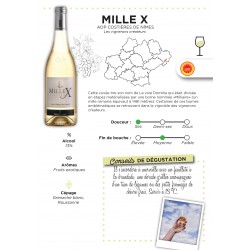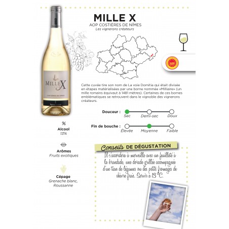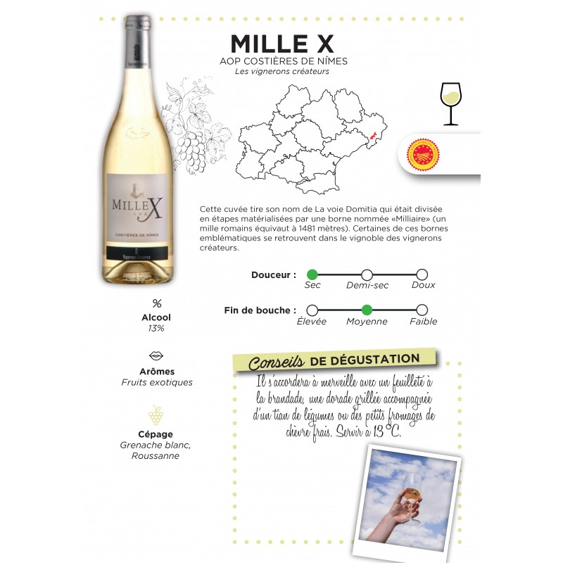La cuvée Mille X des Costières de Nîmes honore l’histoire de la via Domitia, 1ère voie construite par les Romains en Gaule. Certaines bornes de cette voie se retrouvent dans ce vin de robe dorée, de nez fin et de bouche ronde, fraiche et florale.