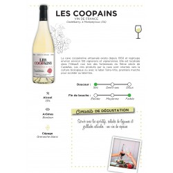 Les Coopains blanc est un vin monocépage qui possède une belle robe jaune pâle aux reflets verts et un nez minéral et floral, qui dévoile des notes de bonbons acidulés. Un vrai vin de copains, qui plaira autant aux amateurs qu'aux plus avertis !