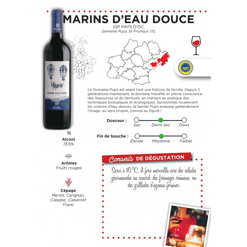 Surnommés localement les "marins d'eau douce", la famille Pujol endosse gaillardement l'image, au sens propre, comme au figuré ! La cuvée Marins d'eau douce IGP Pays D'Oc est un vin rouge issu de l’assemblage de quatre cépages, vendangés à maturité optimale. Sa robe rouge rubis laisse percevoir des notes de fruits rouges et noirs bien mûrs.