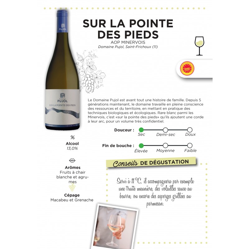 Rare blanc parmi les Minervois, c'est "sur la pointe des pieds" que la famille Pujol ajoutent une corde à leur arc, pour un volume très confidentiel. Avec ses notes d'ananas et de fruits à chair blanche mûrs, il offre une belle vivacité en bouche, entre rondeur et douceur.
