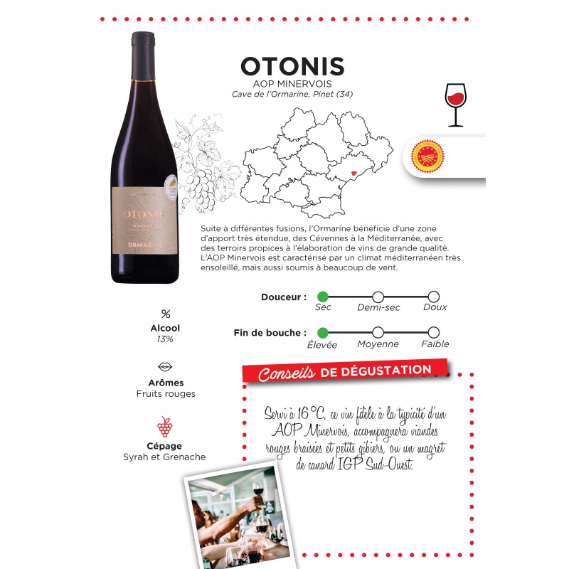 L'Otonis rouge AOP Minervois est issu de l’assemblage des cépages Syrah et Grenache. Il présente une robe pourpre aux reflets violacés. Son nez ample offre des arômes de petits fruits rouges frais. Souple et généreux en bouche, il dévoile une belle finesse.