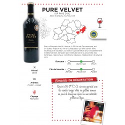 Le Pure Velvet possède une belle couleur rouge aux reflets rubis dus au cépage Marselan qui le compose. Le nez révèle des arômes de fruits rouges (la cerise ou la mûre). La bouche est bien équilibrée avec des tanins souples et fondus. Le final est fruité, soyeux, légèrement épicé avec une bonne longueur.