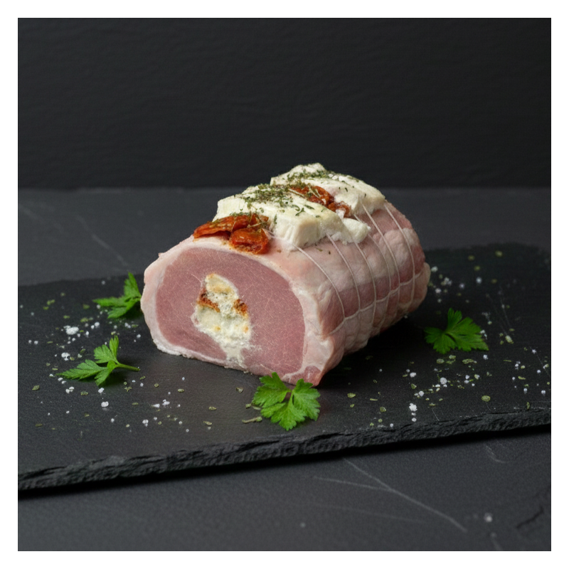 Roti de Porc Aveyron filet, Buche de chèvre, Tomates confites