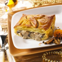 Ce feuilleté à la pâte pur beurre est garni d'une farce au poulet, de bloc de foie gras de canard et de cèpes. Cuit au four, il est croustillant et savoureux.