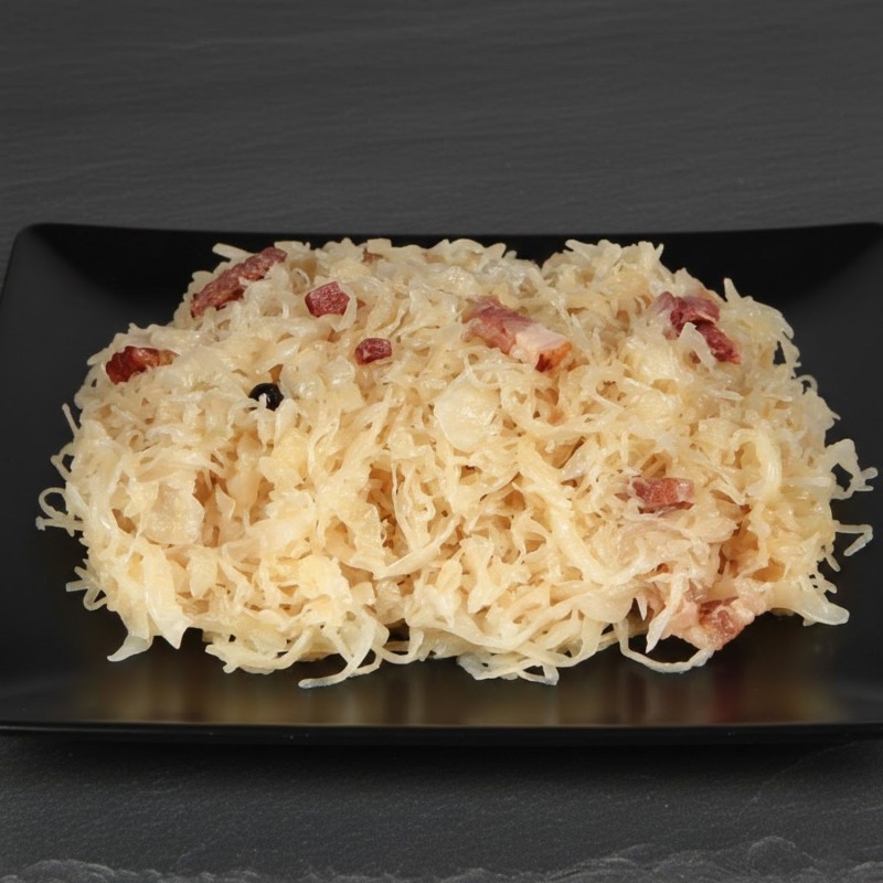 Choucroute origine France (chou, sel) 88%, eau, graisse d’oie 3%, lardons (poitrine de porc origine UE, sel), oignons, champagne, sel, poivre, genièvre