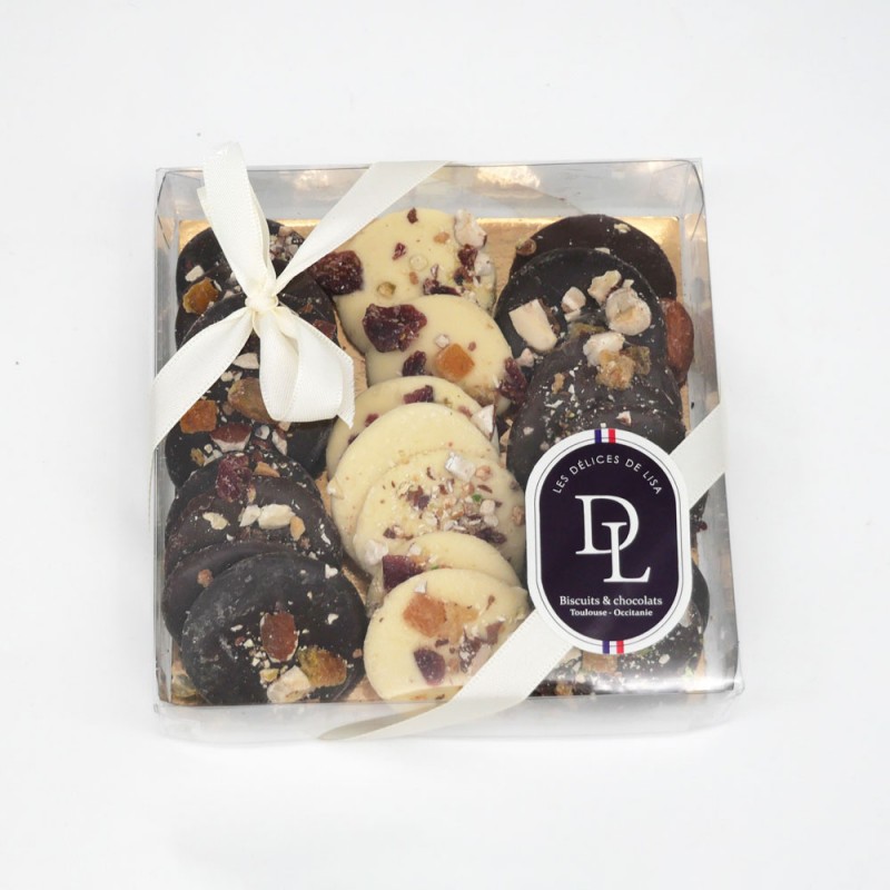 Découvrez cette boîte de mendiants aux trois chocolats : noir, lait et blanc. Chaque pièce est délicatement garnie de fruits secs et de noix croquantes, offrant une bouchée à la fois gourmande et croustillante.