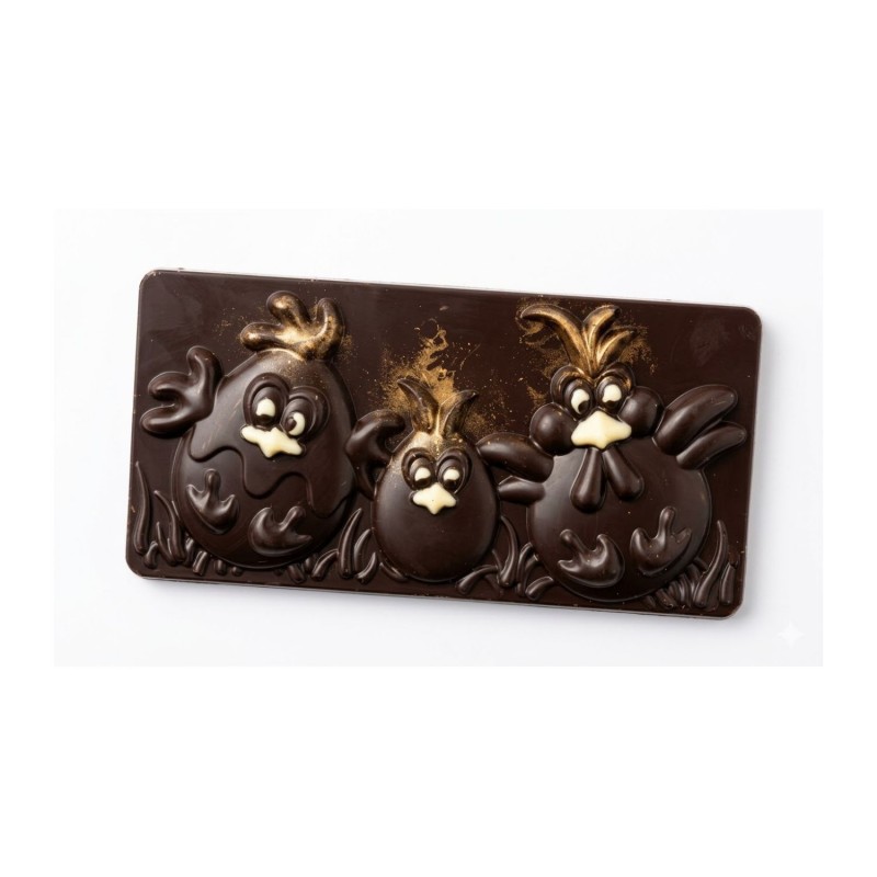 "Les Délices de Lisa" vous propose une tablette de chocolat noir décoré de poulettes !