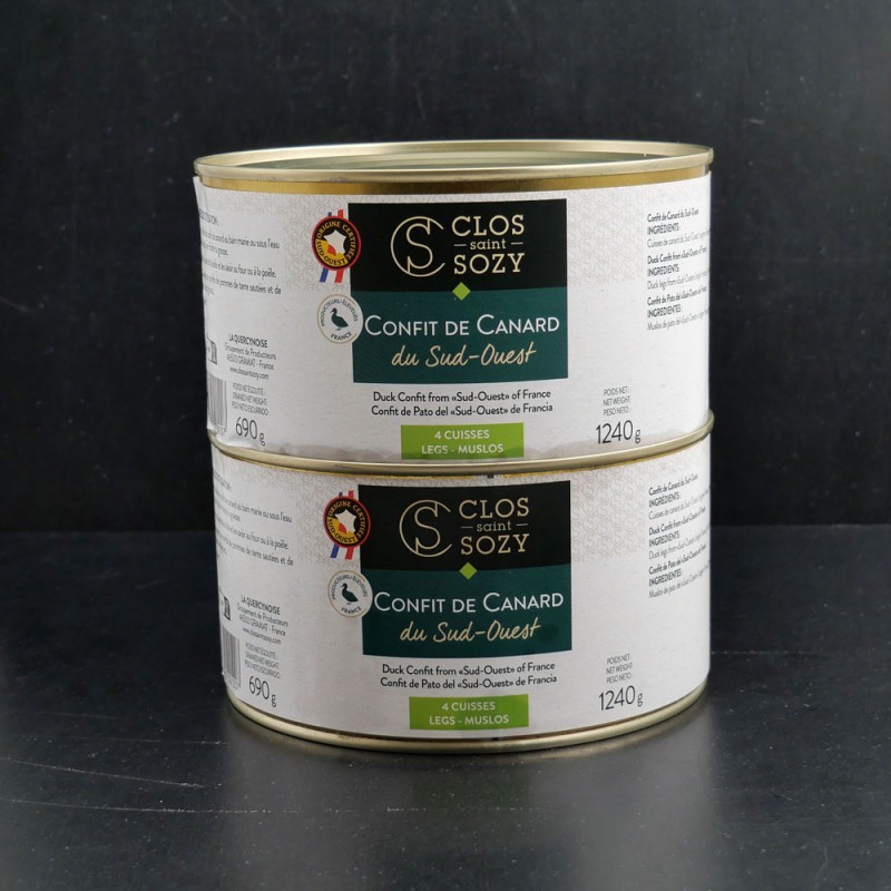 Ce confit de canard composé de 4 cuisses est préparé selon la méthode traditionnelle : salé, puis cuit longuement dans sa graisse pour obtenir une chair fondante et savoureuse. Conditionné avec soin, il garantit une conservation naturelle.