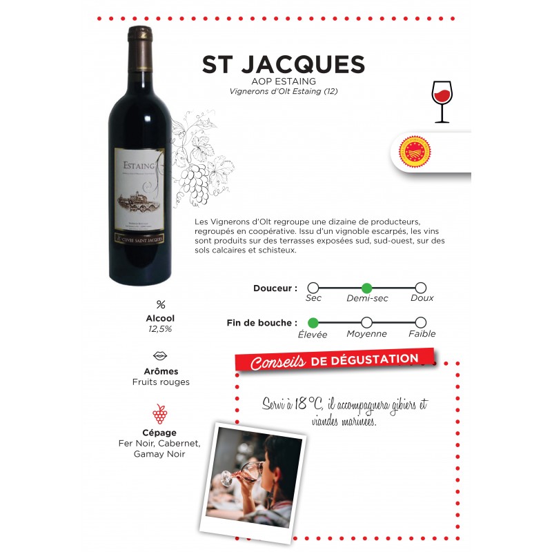 La cuvée Saint-Jacques AOP Estaing est un vin rouge souple, élégant et fruité. Sa robe présente une teinte cerise aux reflets rose-orangé. Le nez offre une intensité poudrée, dominée par des notes de vanille qui évoluent vers des arômes de fruits cuits, de violette et de griotte. En bouche, l'attaque est franche, révélant des arômes de fruits rouges, des tanins fondus, et une finale créant une harmonie séduisante.