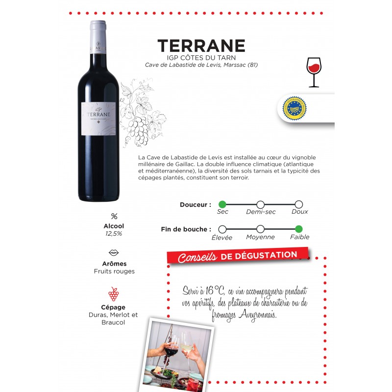 Le Terrane Rouge IGP Côtes du Tarn est un vin souple et fruité. Il est issu d’un assemblage de 3 cépages : Duras, Merlot et Braucol.