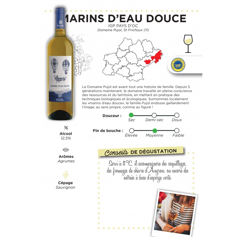Surnommés localement les "marins d'eau douce", la famille Pujol endosse gaillardement l'image, au sens propre, comme au figuré ! La cuvée Marins d'eau douce IGP Pays d'Oc est un vin blanc sec et fruité. Sa robe or pâle aux reflets verdâtres annonce un nez aux accents de fruits de la passion et de pamplemousse. En bouche, il est frais et léger.