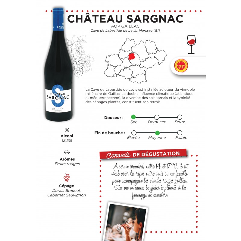 Le Château Sargnac est un vin rouge issu de l'AOC Gaillac, élaboré selon des méthodes traditionnelles. Ce vin, aux arômes complexes et à la structure tannique, est un véritable ambassadeur du terroir gaillacois les cépages : Duras, Braucol, Cabernet Sauvignon.