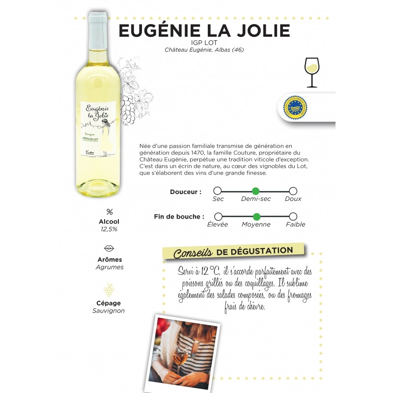 L’Eugénie la Jolie Blanc est un vin blanc vif et fruité, parfait pour les amateurs de vins frais et aromatiques. Issu à 100% de Sauvignon Blanc, ce vin exprime toute la fraîcheur du cépage et la typicité des terroirs du Lot.