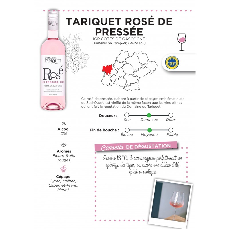 Le Tariquet Rosé est un vin rosé de pressée, élaboré à partir de cépages emblématiques du Sud-Ouest. Sa vinification spécifique lui confère une belle fraîcheur et une aromatique délicate. Cépages : Syrah, Malbec, Cabernet Franc, Merlot