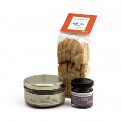 Marbré de volaille festive 130g - Préparation à base de viande de dinde et aux foie de canard 20% foie gras. Ingrédients : viande de dinde (Origine : France) 78%, foie gars de canard 20%, sel, gélatine de bœuf déshydratée, poivre. Traces possibles d’ŒUFS, NOIX et GLUTEN. Valeurs nutritionnelles moyennes pour 100g : énergie 852kj / 205kcal - matières grasses 15g (dont acides gras saturés 5,6g) – glucides 0,6g (dont sucres <0,5g) – protéines 18g – sel 1,7g. Toasts apéritifs 40g - Ingrédients : farine de BLE française, huile de coco non hydrogénée, sucre, levure boulangère, sel, malt d’ORGE. Valeurs nutritionnelles moyennes pour 100g : énergie 1655kj / 368kcal - matières grasses 7,5g (dont acides gras saturés 6,2g)– glucides 62g (dont sucres 4,7g) – protéines 11g – sel 1,2g. Confit de figues aux noix 35g - Ingrédients : oignons, figues (27%), prunes, sucre de canne*, noix non traitées (8%), vinaigre de cidre*, jus de citron, beure (lait), sel de Guérande. * Issu de l’Agriculture Biologique